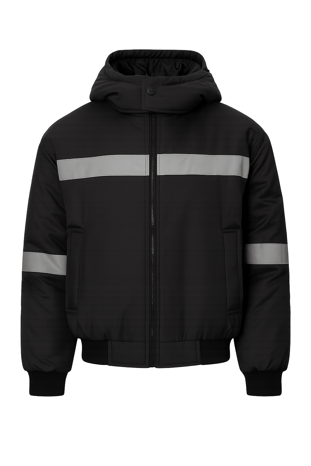 Blouson Bomber Noir avec Bandes Réfléchissantes. Chaud, confortable, et haute visibilité pour une sécurité accrue de nuit.