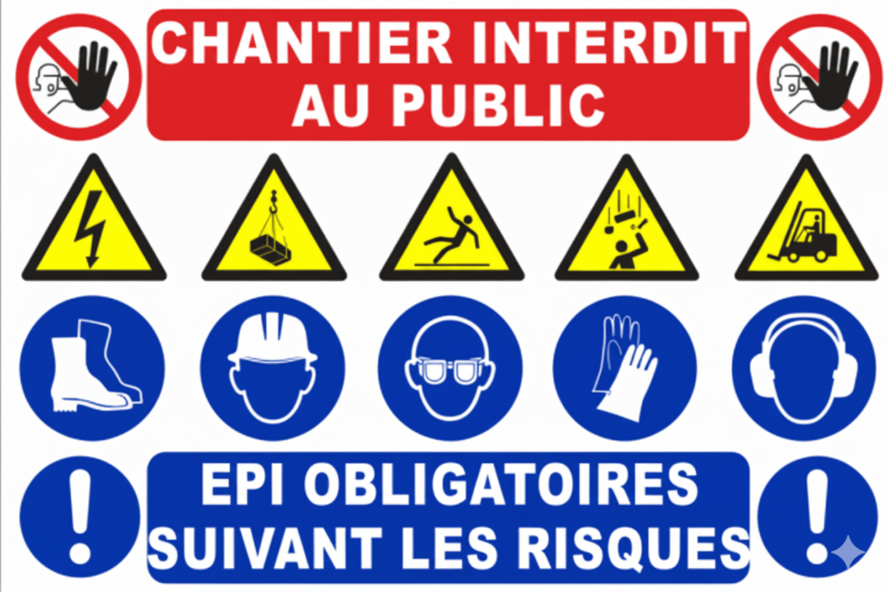 - Interdiction d’Accès : Mention claire CHANTIER INTERDIT AU PUBLIC et pictogrammes de non-entrée.